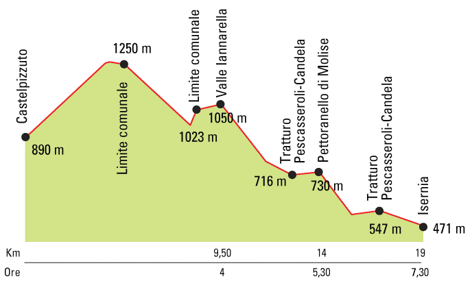 Percorso alternativo. Incontrata la strada che conduce a Vallesoda si gira sulla destra e percorrendo il tracciato erboso che porta nel rimboschimento di Colle La Giardia, nei pressi delle masserie Ferritti, si volta a sinistra e si prosegue poco dopo aver superato il gruppo di case; si prosegue a destra superando il fiume Carpino nei pressi del cosidetto “feudo” una volta luogo di bagni estivi. Si è giunti alla periferia di Isernia.